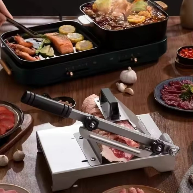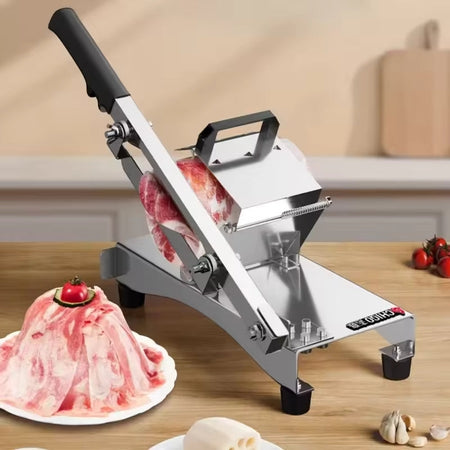 Denne justerbare skærer har et håndtag, der giver sikker kontrol under skæring af frugt, grøntsager eller andre fødevarer. Den kan bruges på køkkenborde eller arbejdsflader for effektiv indendørs madlavning.