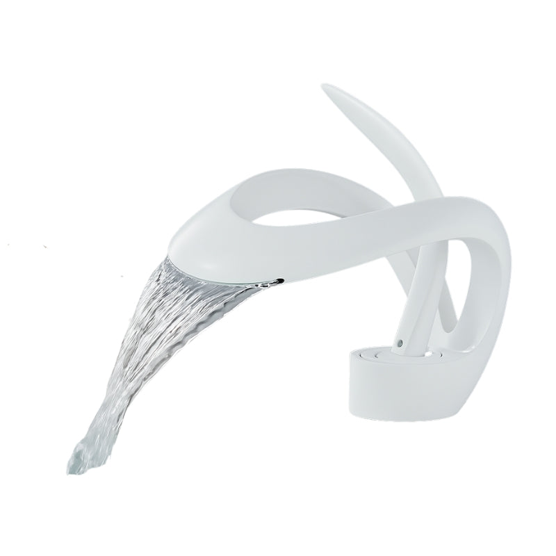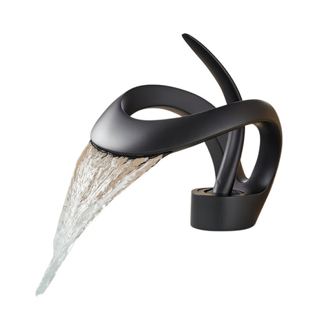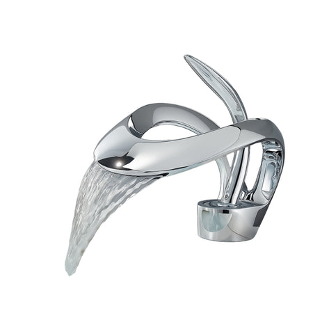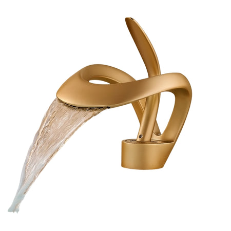 AquaSculpt-badeværelsesarmaturet har en vandfaldsudløb for en glidende vandstrøm. Det er lavet af massivt messing og har et enkeltgrebs-håndtag til styring af vandtemperatur og flow. Velegnet til badeværelsesvaske og moderne interiører.