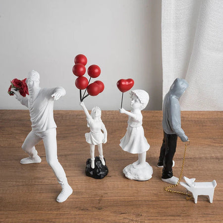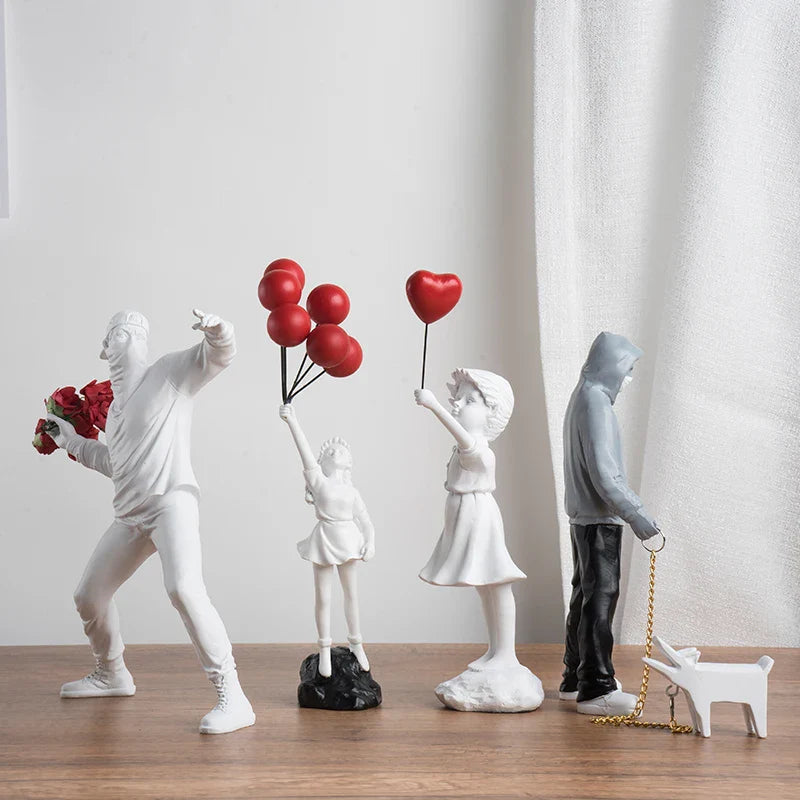 ArtistryVibe-figurkollektionen indfanger stærke temaer som kærlighed, frihed og glæde gennem detaljeret skulptur og moderne kunst. Hver figur, fra en mand med røde blomster til en pige med balloner, fortæller sin egen historie og giver karakter og varme til dit rum. Med markante farvekontraster og unikke positurer giver disse figurer både kunstnerisk værdi og en følelsesmæssig forbindelse til ethvert rum, uanset om det er i hjemmet eller på kontoret.