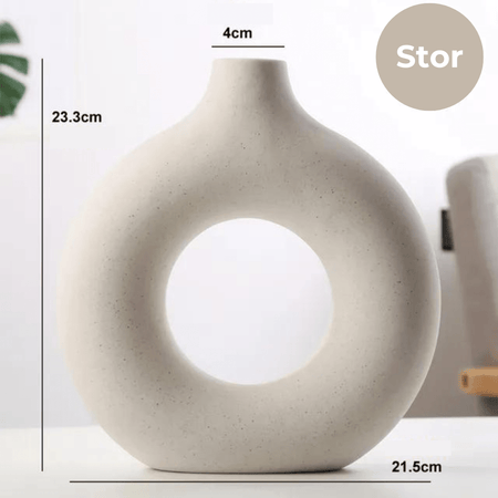 Hver AuraDonut Vase er håndlavet til perfektion og tilbyder en glat, delikat overflade, der afspejler kvalitetshåndværk. Dens hule centrum giver mulighed for en iøjnefaldende fremvisning af blomster, pampasgræs eller endda fjer, hvilket gør den til en alsidig dekoration til enhver lejlighed. Det enkle, men modige design fungerer problemfrit med andre dekorative genstande, og forstærker ethvert rum med en kunstnerisk flair.