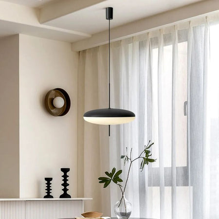Den AuraLume LED hængelampe har et rundt design, der passer til forskellige indendørs områder. Den kan installeres i stuer, spisesteder eller kontorer som en del af loftsbelysningen.