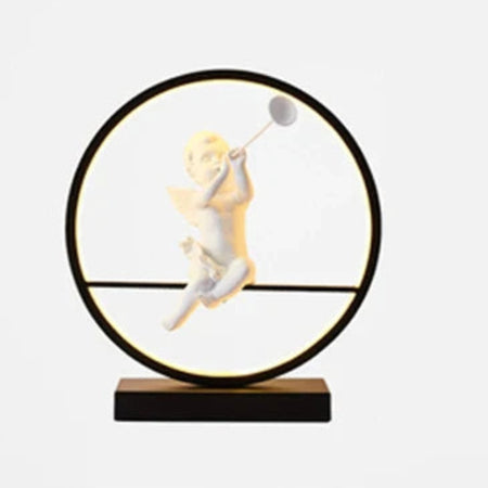 AuraRing - Kunstnerisk LED-bordlampe med englefigur og lysende cirkulær ramme