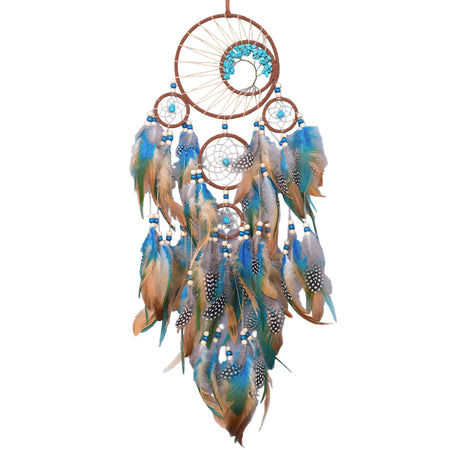 Håndlavet drømmefanger med turkise perler, fjer og livets træ motiv