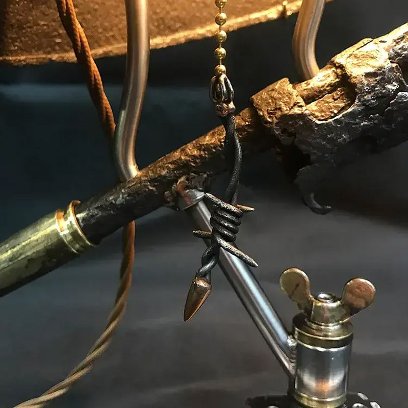 Disse unikt designede lamper genbruger vintage militærhjelme til slående statement-stykker. Hver lampe fremviser en anden hjelmstil, komplet med kunstneriske udsmykninger såsom pigge, distressed finishes, og endda en udragende kniv for en dramatisk effekt. Kombinationen af historiske elementer med moderne belysning skaber et samtalestartende indretningsstykke, der blander robust charme med funktionelt design.