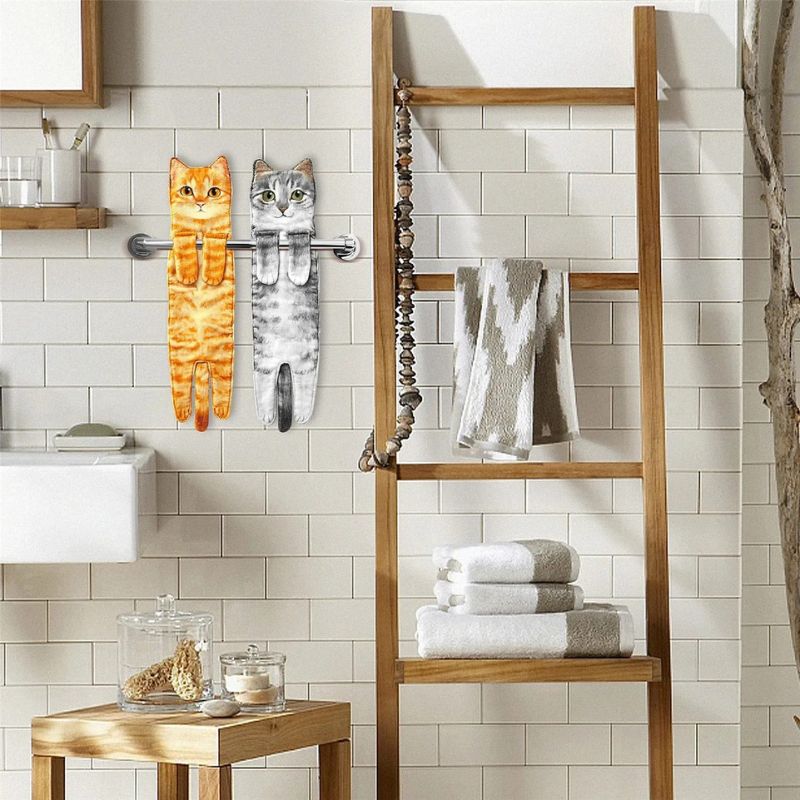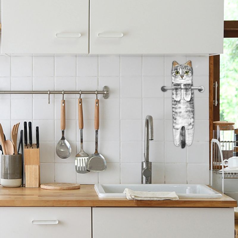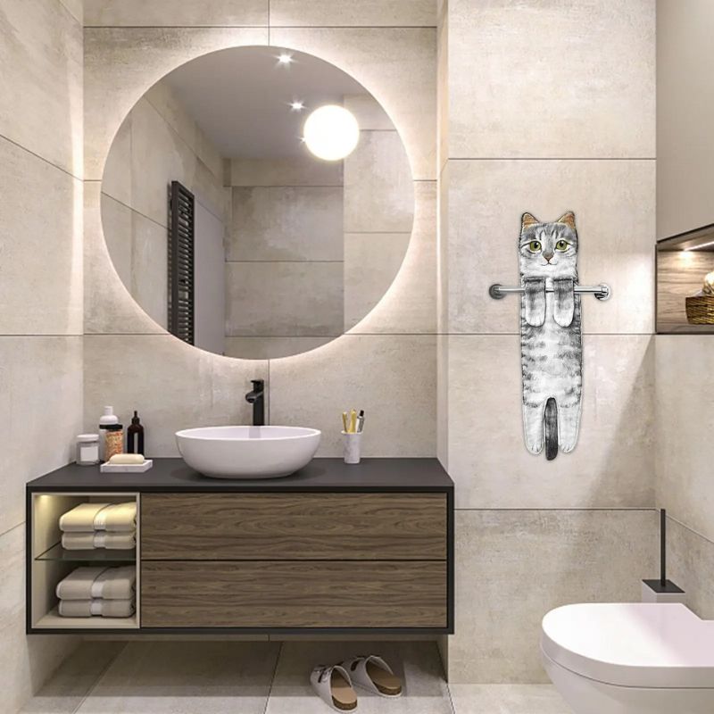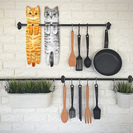Dette håndklæde har et kattedesign og ophængningsløkker til placering på kroge eller stænger. Det er let og nemt at håndtere, velegnet til køkkener, badeværelser eller andre husholdningsområder.