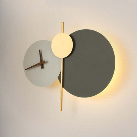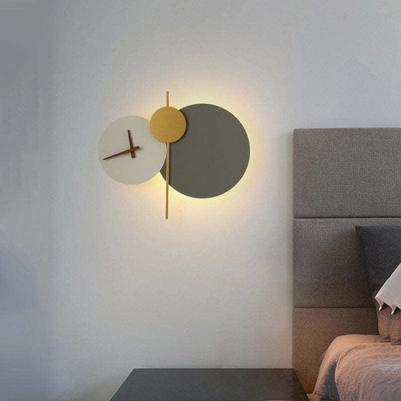 ChronaGlow moderne vægklokkelampe kombinerer overlappende cirkelformer med integreret LED-belysning. Den vægmonterede klokke giver både tidsvisning og stemningslys i én enkel enhed. Fremstillet med en jernramme og akrylskærm, velegnet til indendørs rum som stuer, kontorer eller gange.