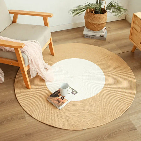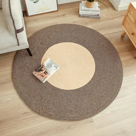 - Rundt tæppe med et struktureret koncentrisk cirkeldesign
