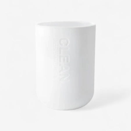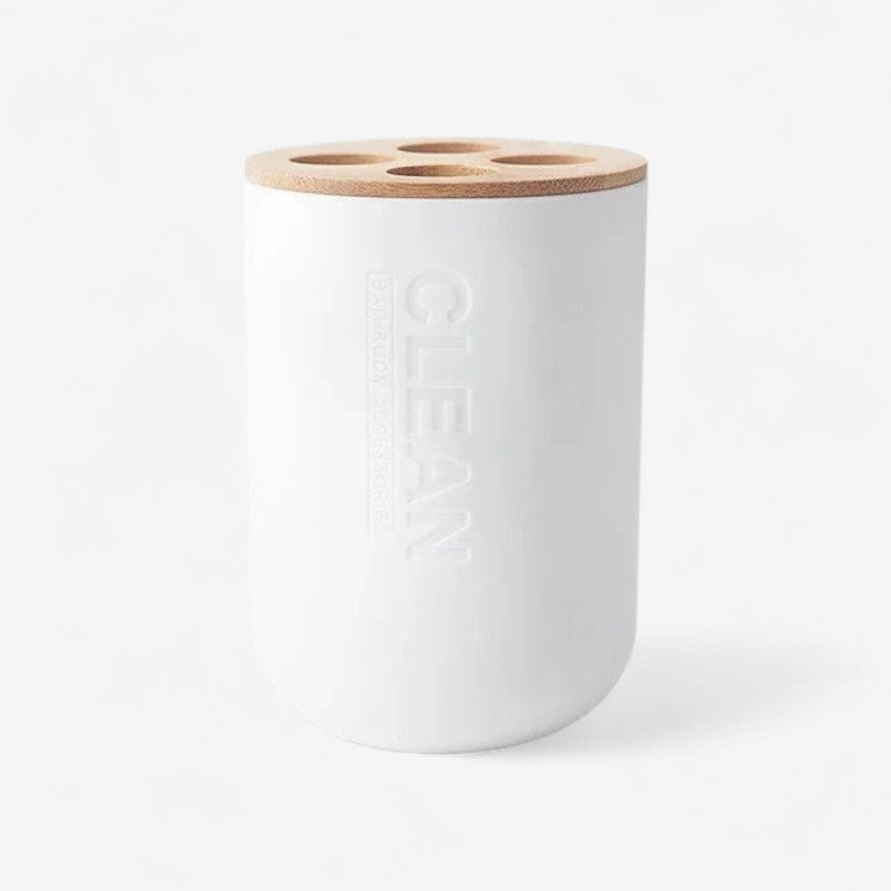 CleanForm badeværelsestilbehørssættet indeholder en sæbedispenser og matchende genstande, designet til regelmæssig brug i badeværelser eller vaskerum. Sættet har en enkel struktur, der egner sig til placering på borde eller hylder.