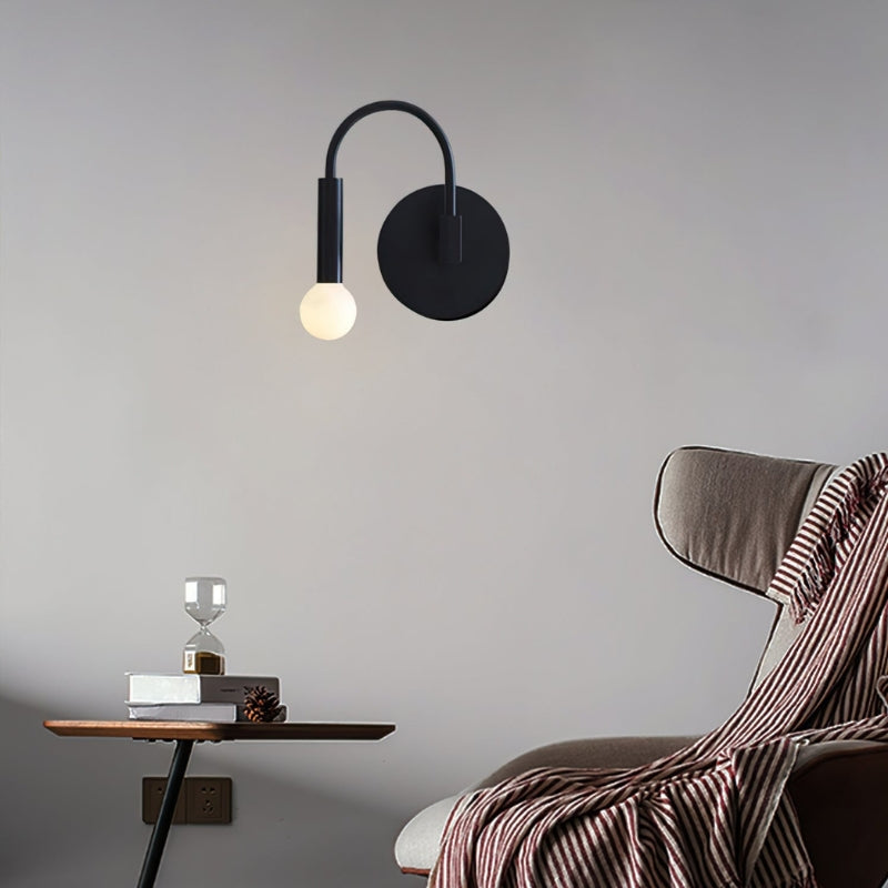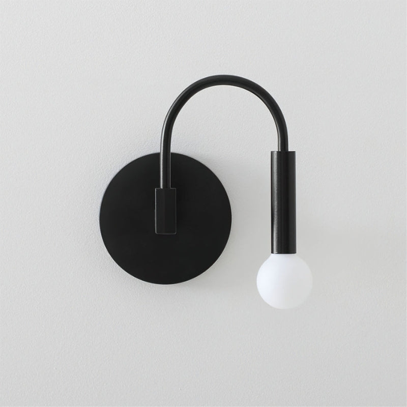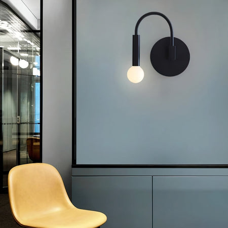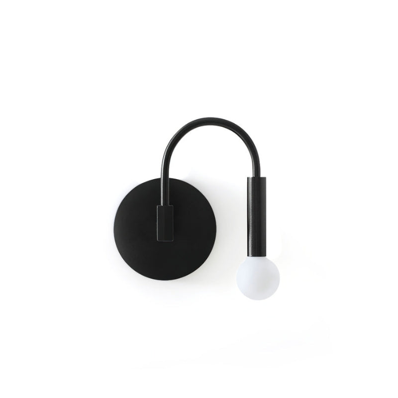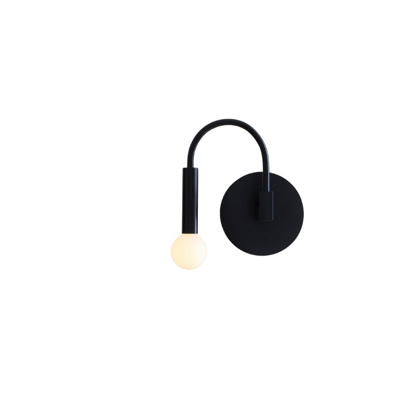 CurveLite væglampen har en mat sort cirkulær monteringsplade med en buet arm og en sfærisk pæreholder. Kompatibel med både matterede og klare pærer, den giver blødt, stemningsfuldt eller direkte lys. Designet til indendørs brug, er den velegnet til stuer, soveværelser, gange eller kontorer, og det vægmonterede design sparer plads.