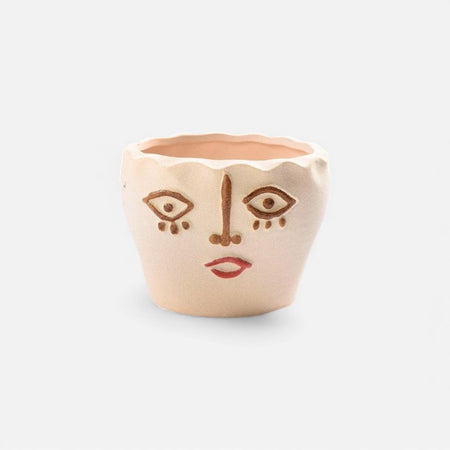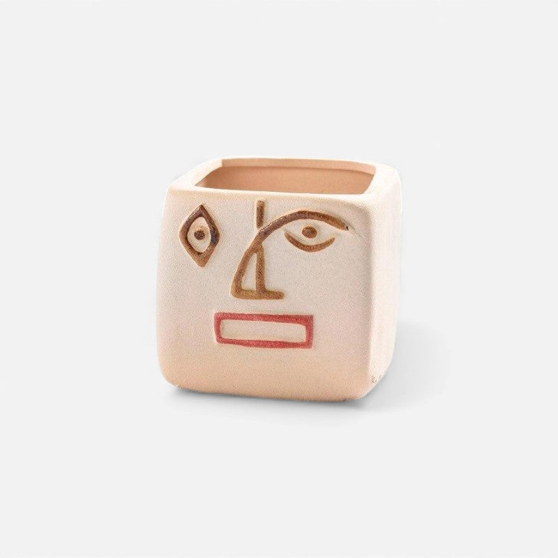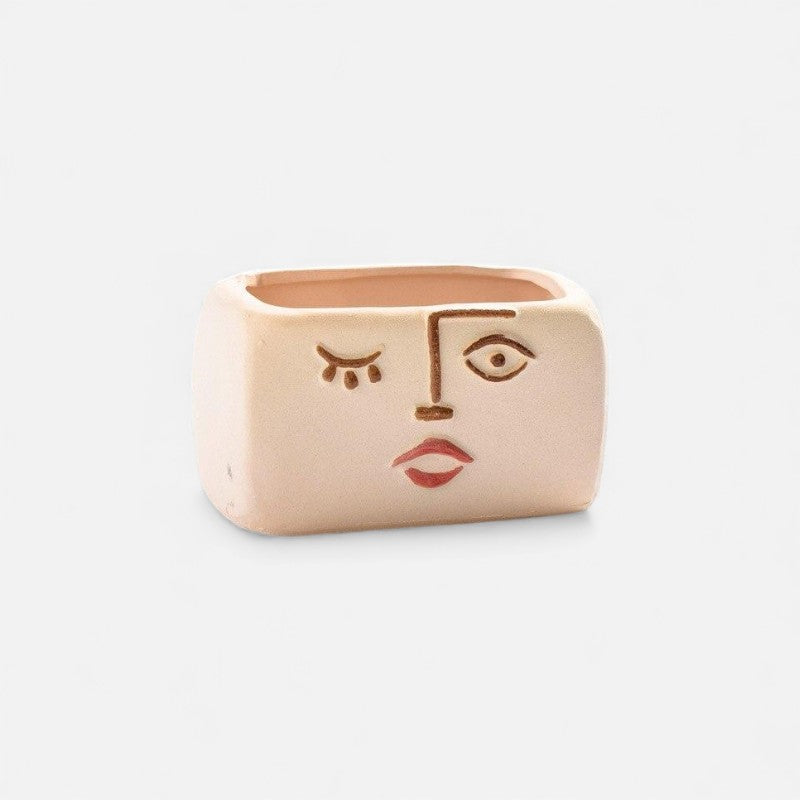 Denne blomsterpotte har et menneskeansigt-inspireret design, som passer til forskellige indendørs omgivelser. Den kan rumme små planter eller dekorative arrangementer og kan placeres på skriveborde, hylder eller borde.