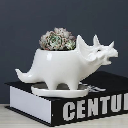 Blomsterpotte med dinosaurinspireret design til indendørs bordplacering