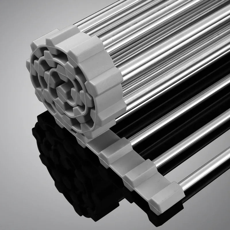 Når det ikke er i brug, kan dette tørrestativ rulles sammen til kompakt opbevaring, hvilket gør det perfekt til ethvert køkken. Den robuste struktur giver pålidelig støtte, mens det sikre greb holder den på plads under brug. Det er et vigtigt værktøj til at holde bordpladerne pæne og ryddelige.