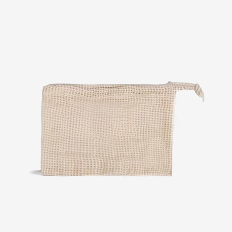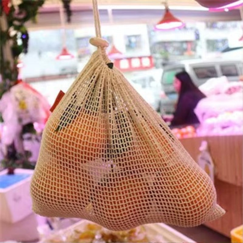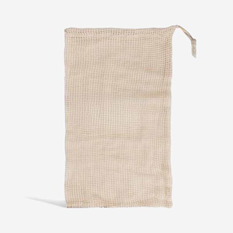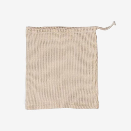 EcoVeg grøntsagspose har en snørelukning, der holder indholdet sikkert. Posens vaskbare design gør den egnet til opbevaring eller transport af grøntsager i forskellige situationer.