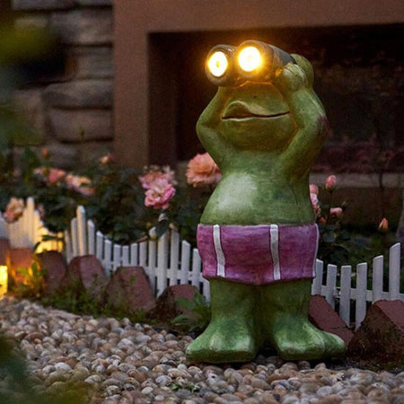 FroggyGlow udendørs natlampe har et frødesign med store øjne og lyserøde shorts. Fremstillet af holdbar resin, er den fuldstændig vandtæt og egnet til haver, terrasser, stier eller legeområder. Frøens øjne fungerer som lyskilder og giver et blødt skær, samtidig med at lampen fungerer som en dekorativ detalje. Dens farver og design gør den perfekt til udendørs dekoration.