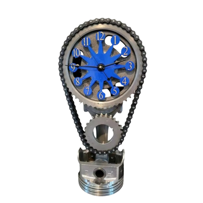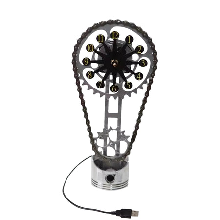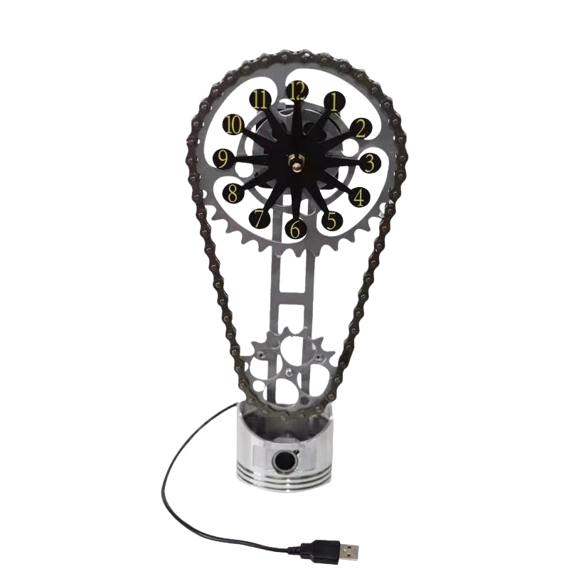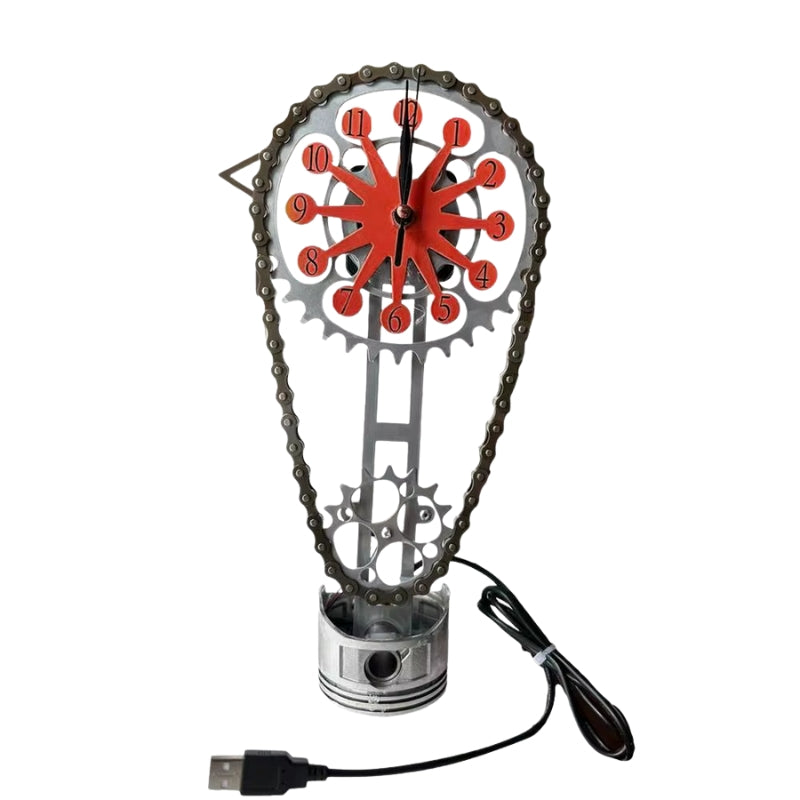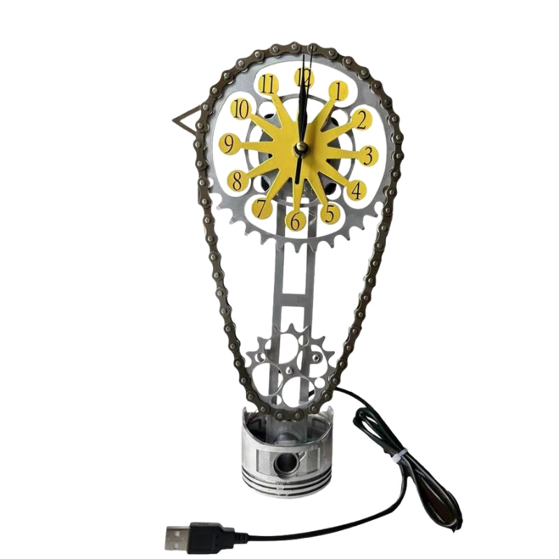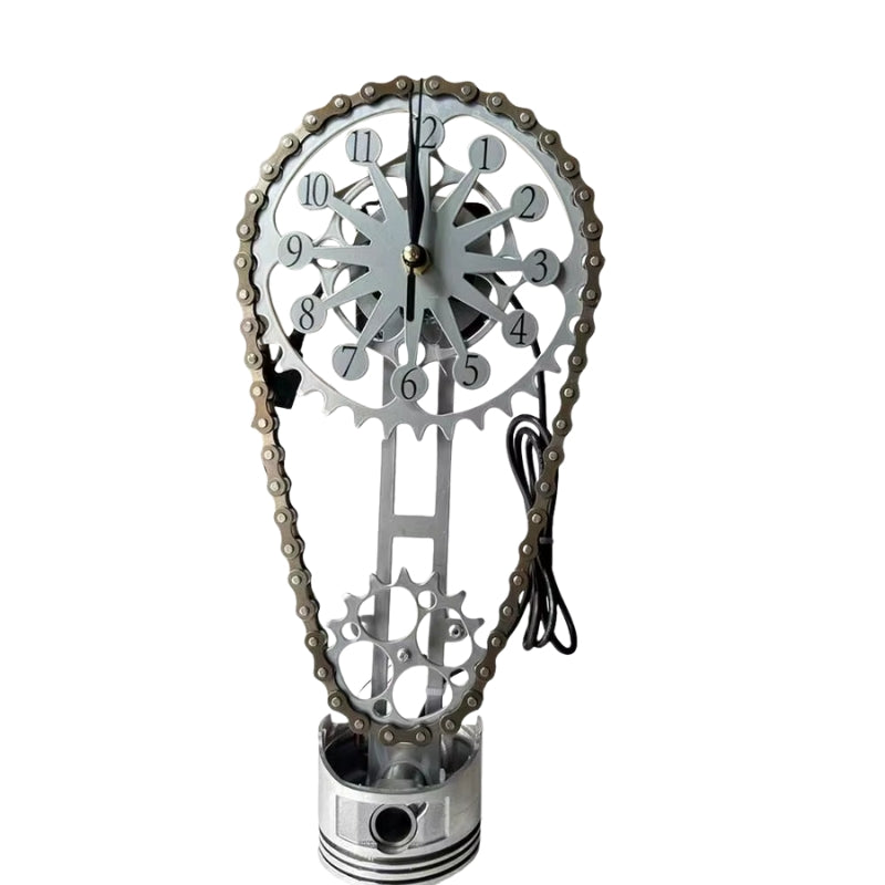 GearGlow-uret har en urskive i tandhjulsstil med synlige mekaniske detaljer, herunder en base i stempelstil og en kæde som dekorativt element. Det er designet til både fritstående og vægmonteret brug og tilfører et industrielt præg til interiører såsom studier, garager eller tematiserede arbejdsrum. Uret drives af et kvartsurværk, som sikrer præcis og næsten lydløs tidsvisning.