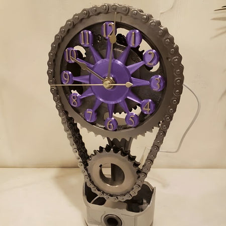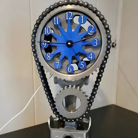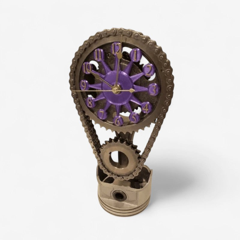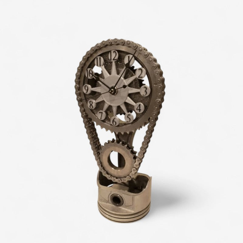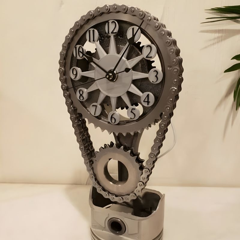 Dette bordur har et tandhjuls og kædedesign. Det kan placeres på skriveborde, hylder eller sideborde som en indendørs dekorationsgenstand.