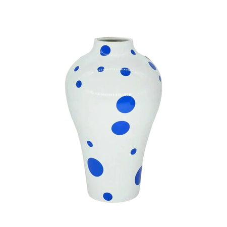 GeoGlow er en livlig keramisk vase, designet til at tilføre dimension og farve til moderne indretning. Den er glaseret i en dyb blå farve og udsmykket med polkaprikker og en quiltet geometrisk overflade, hvilket gør den velegnet som både blomsterbeholder og dekorativt objekt. Med sin brede åbning og skulpturelle form fungerer den som et alsidigt statement-piece i ethvert rum.