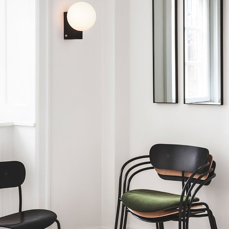 GeoGlow væglampen har en metalbase og en rund glasglobus, der giver blødt, varmt lys. Designet til indendørs brug, er den velegnet til gange, soveværelser, stuer eller arbejdsområder. Dens geometriske form giver et moderne udtryk, samtidig med at den forbliver funktionel.