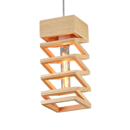 GeoWood moderne pendellampe har et lagdelt open-box-design fremstillet af lyst træ, der fremhæver en prominent eksponeret pære. De vekslende kvadratiske lag skaber et iøjnefaldende geometrisk udseende, mens de naturlige trætoner giver varmt lys.