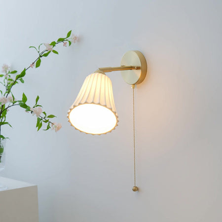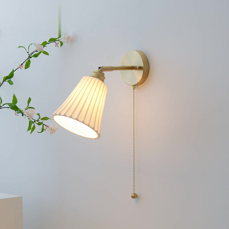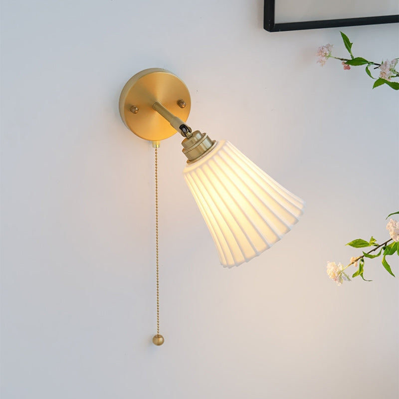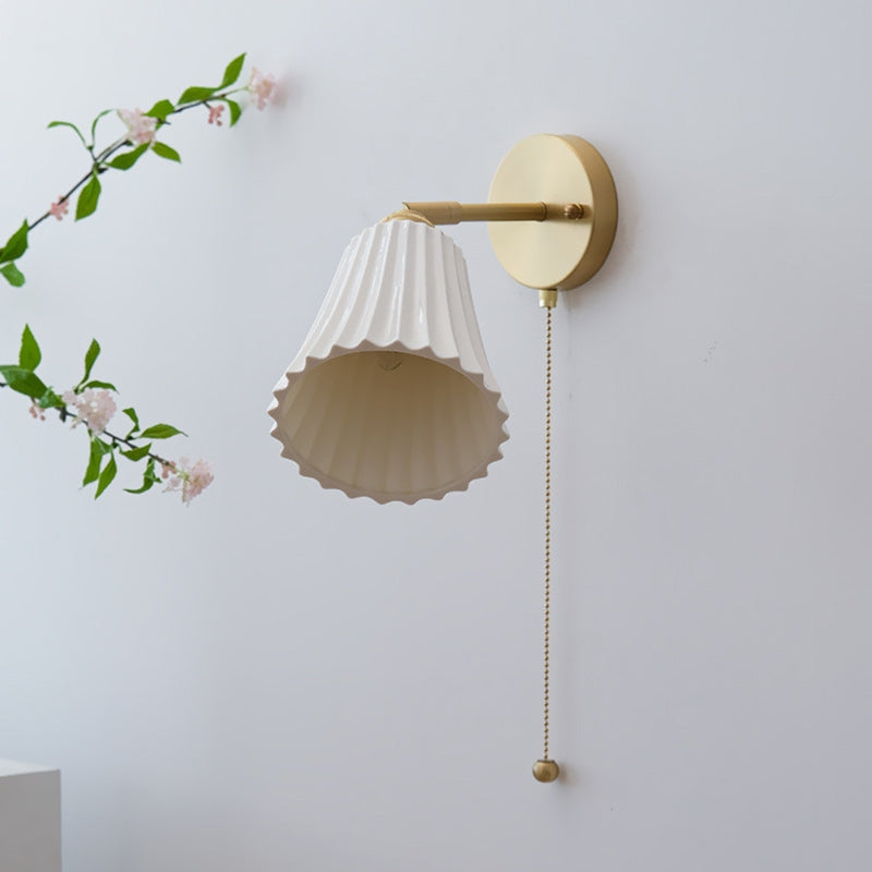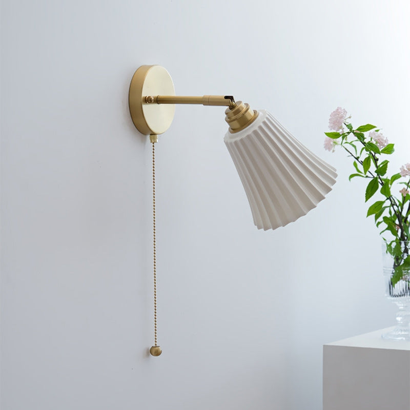 Væglampe med justerbar arm og hvid plisseret skærm. Base i børstet guldmetal. Trækæde med dekorativ kugle i enden til betjening. Velegnet til læsehjørner, soveværelser eller opholdsrum. Passer til moderne, vintage eller eklektisk indretning.