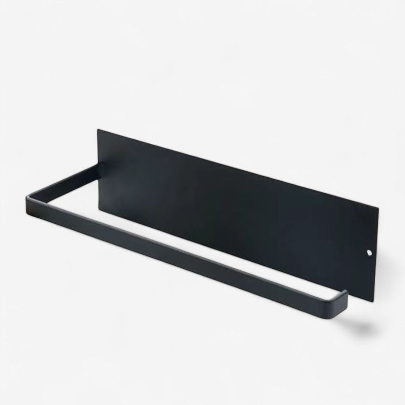 Denne håndklædeholder har en selvklæbende bagside og bøjle til vægmontering i badeværelser eller køkkener. Den holder håndklæder pænt opbevaret uden behov for boring eller ekstra værktøj.