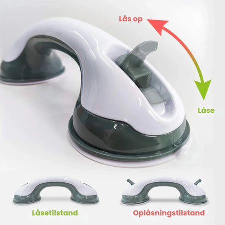 GripSafety-håndtaget har et unikt sugekopdesign, der let klæber til enhver glat, flad overflade. Med opklappelige låsetapper sidder det godt fast, mens det er i brug. Den ergonomiske form sikrer et behageligt greb, som gør det nemt for alle at holde. De stærke sugekopper fungerer effektivt på ikke-porøse overflader som fliser og glas og giver pålidelig støtte, når man skal ind eller ud af badekarret eller bruseren.