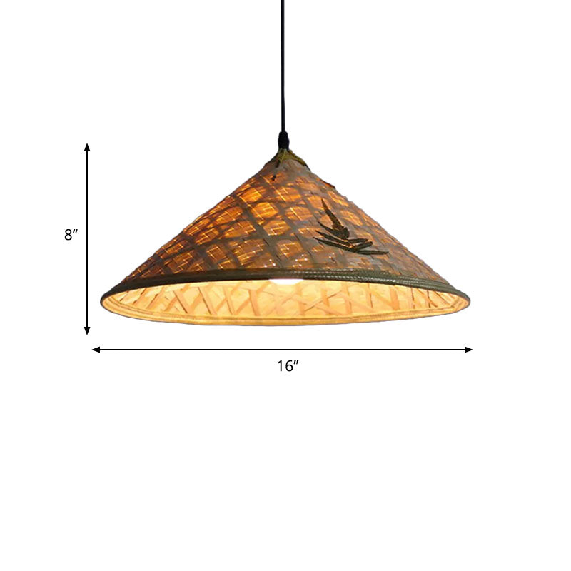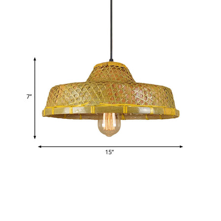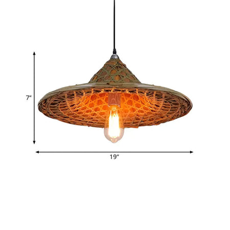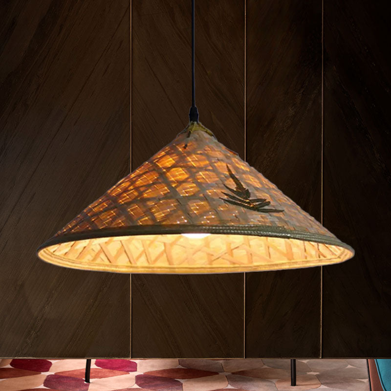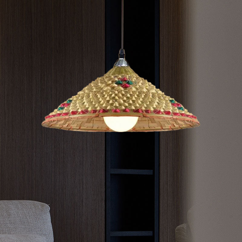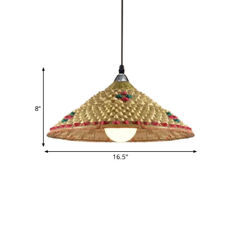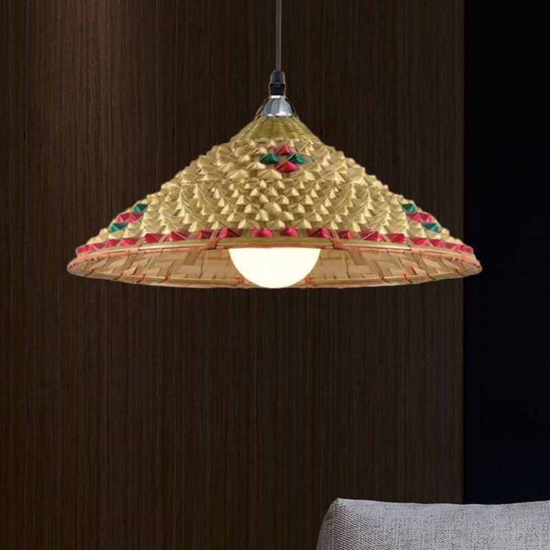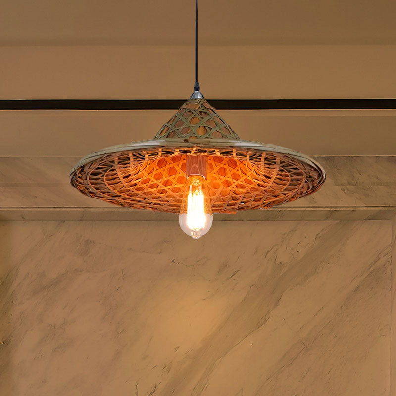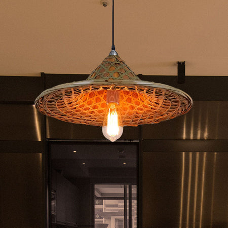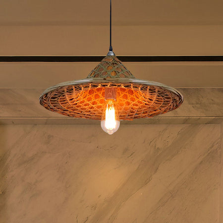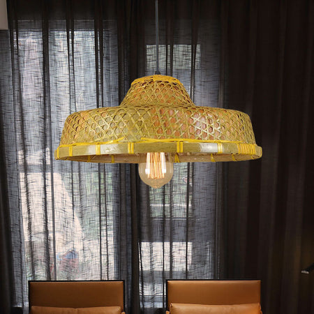 Denne rustikke hat-formede pendel har en bambusskærm, der tilføjer et varmt og naturligt præg til ethvert rum. Den enkelte lysarmatur giver fokuseret belysning, hvilket gør den perfekt til at hænge over spiseborde eller som et accentstykke i rustikke eller orientalsk-inspirerede interiører.