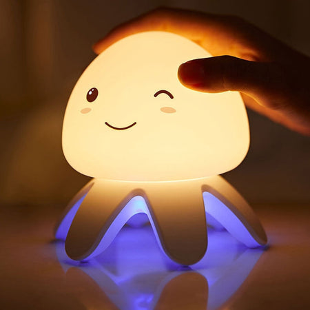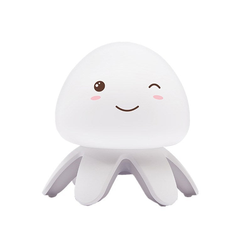 JellyGlow er en LED-natlampe inspireret af en vandmand, med fjernbetjening og indbygget musikfunktion. Lampen har et blødt lysende ansigt og en multicolor lysende base, som skaber en hyggelig atmosfære. Den er USB-genopladelig, bærbar og tilbyder både fjernbetjening og touch-aktivering for nem styring. Velegnet til børneværelser, vuggestuer eller som dekorativ lampe i soveværelset.