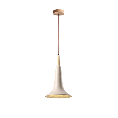 Denne pendellampe har en trompetformet skærm understøttet af en træramme med beige finish. Designet som en enkeltpære-lampe giver den en varm, behagelig belysning, der passer perfekt til spisestuer, stuer eller opholdsrum. Fremstillet i holdbare materialer kombinerer den praktisk belysning med et enkelt, naturligt udtryk, hvilket gør den til et alsidigt valg til indretningen.