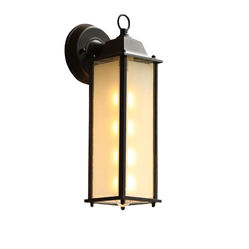 LantaGlow-væglampen har en rektangulær metalramme med klare glaspaneler. Den er kompatibel med standard- eller Edison-pærer og monteres på væggen til brug på verandaer, terrasser, indgange eller andre udendørsområder. Dens alsidige design passer både til traditionelle og moderne omgivelser.