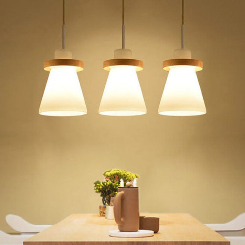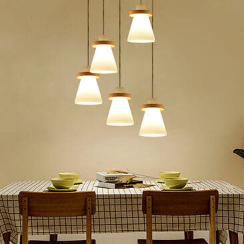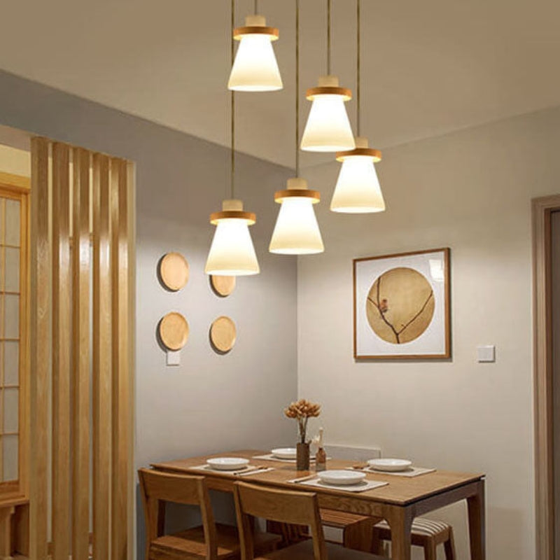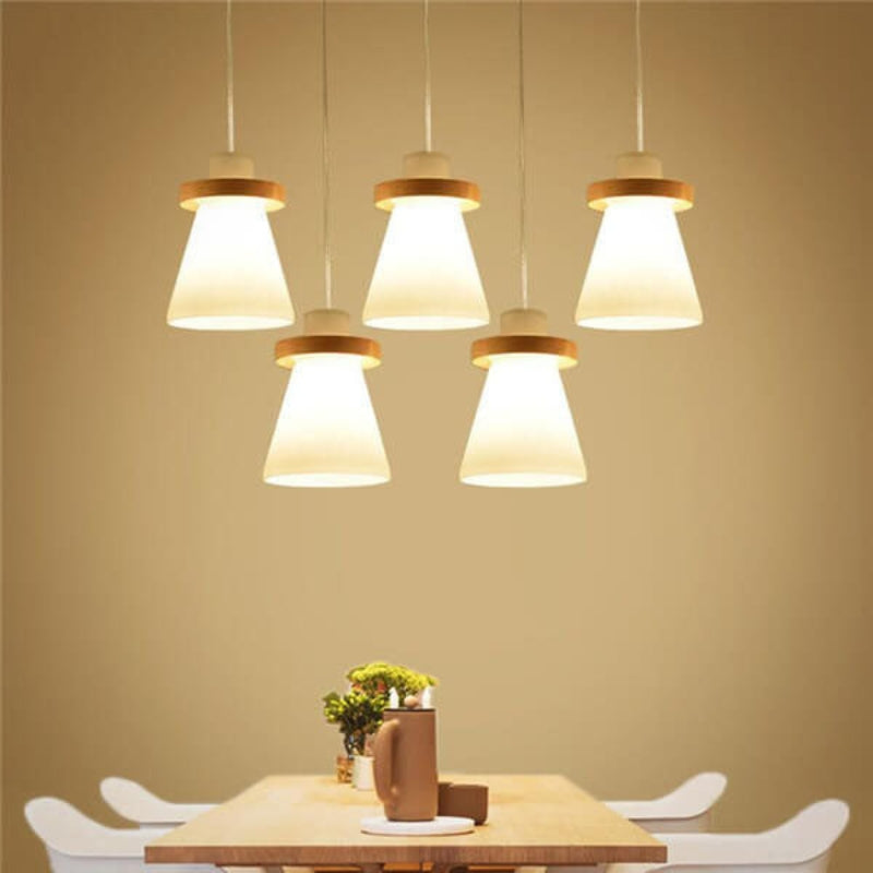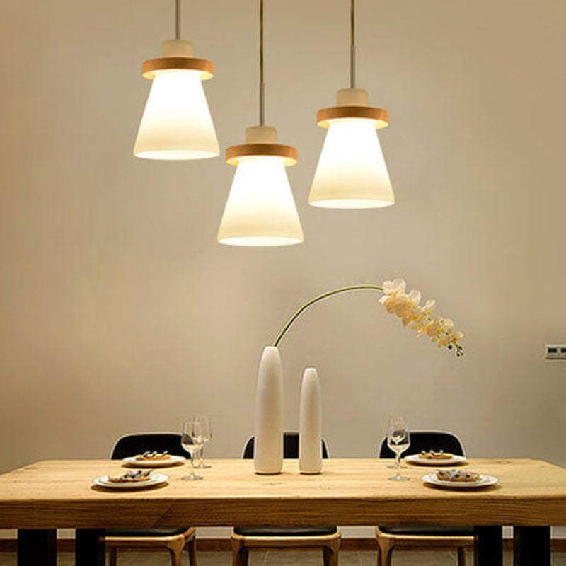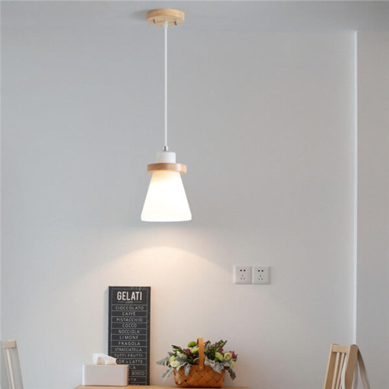LumaBell moderne pendellampe har en konisk frostet glasskærm med en træring øverst, ophængt fra loftet med en justerbar ledning. Lampen udsender varmt lys og skaber en behagelig belysningseffekt.