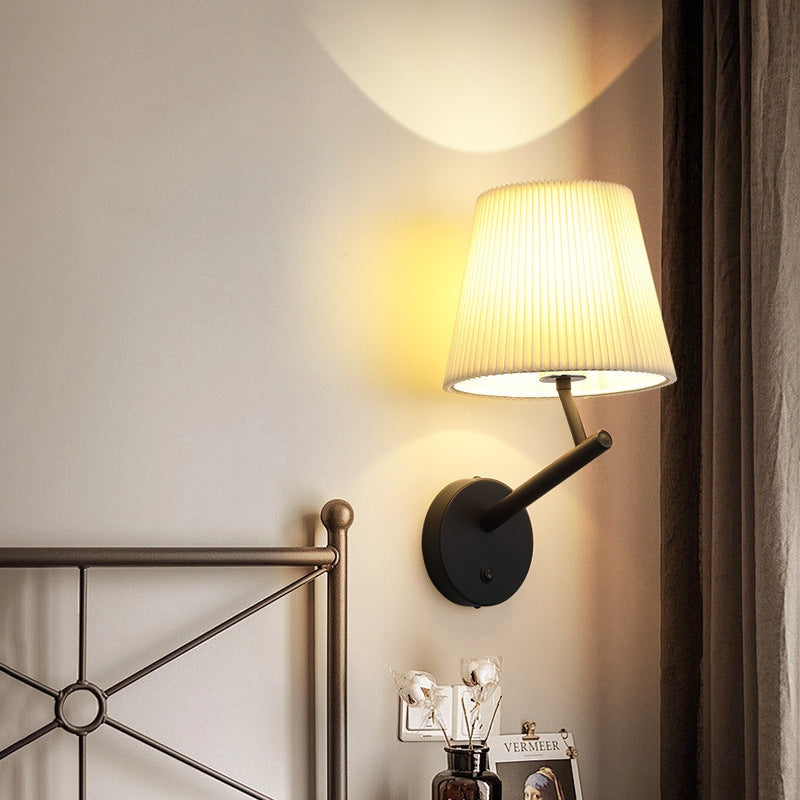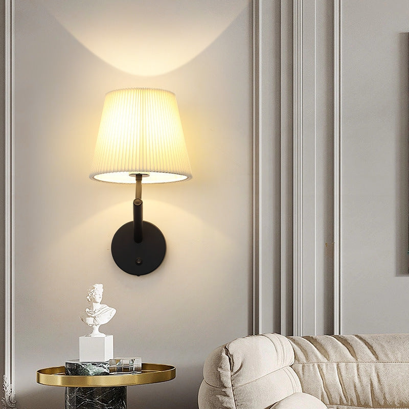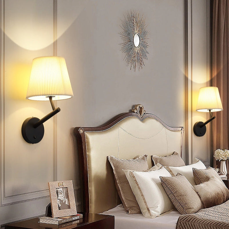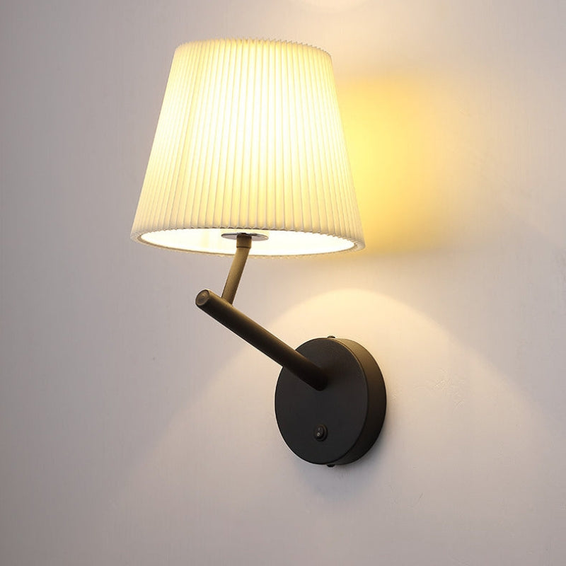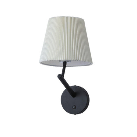 LumaGlow væglampen har en rund base med mat sort finish og en slank arm, der understøtter en cylindrisk plisseret skærm, som blidt spreder lyset. Velegnet til stuer, soveværelser eller gange, giver den funktionel belysning samtidig med, at den komplimenterer moderne indretning.