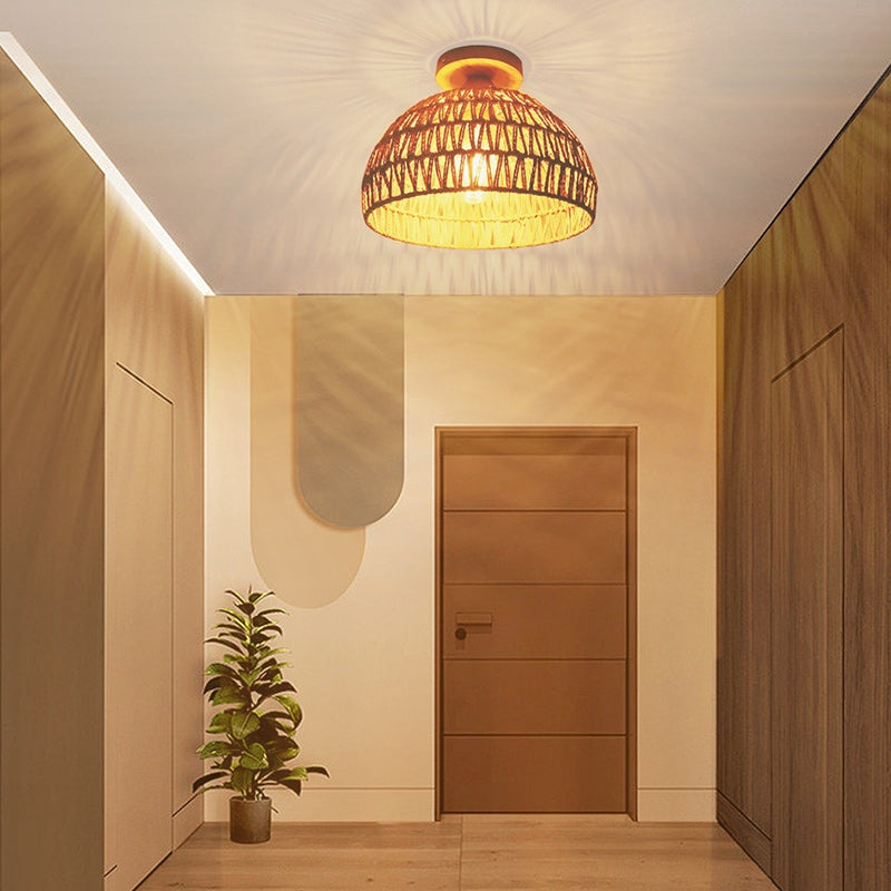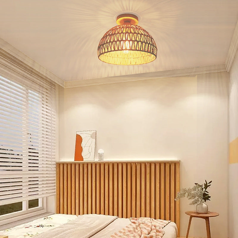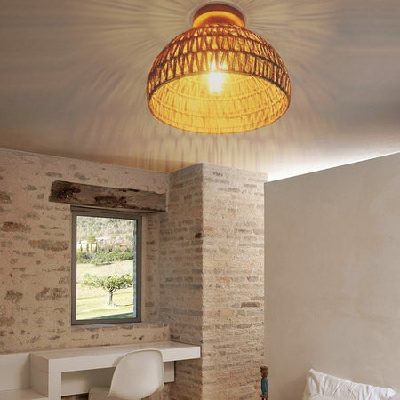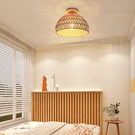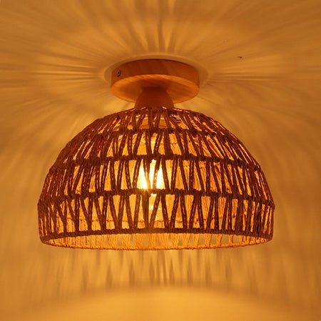 LumiGlow er en semi-indbygget loftslampe inspireret af traditionelt japansk design. Dens kuppelform med vævet rattan-dækning giver et naturligt udseende, velegnet til stuer, soveværelser eller andre indendørsrum. Lyset, der filtreres gennem rattan, giver blød, diffus belysning. Lampen er kompatibel med LED-, gløde- eller lysstofpærer, hvilket giver fleksibel belysning til både moderne og traditionelle interiører.