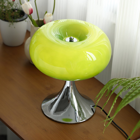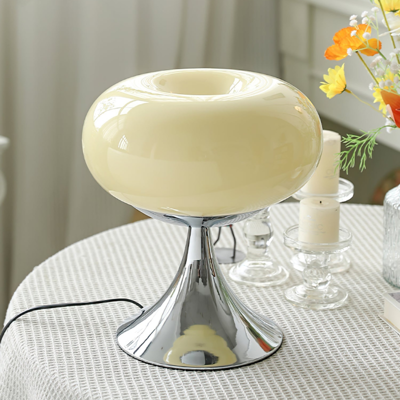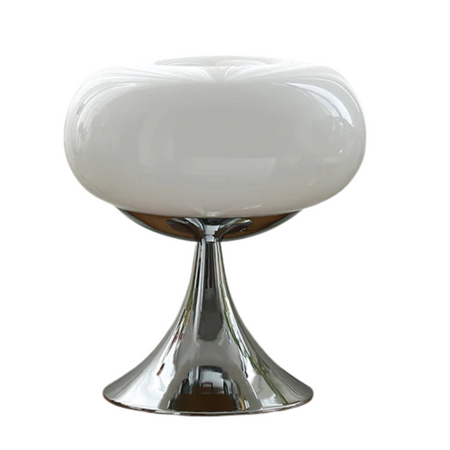 Bordlampe med rundt metal- og glasdesign