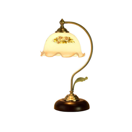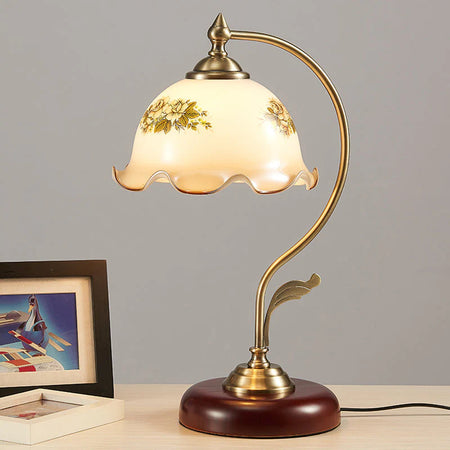 LumiOra-lampen har en kuppelformet skærm i frostet glas med plissering, som giver et blødt og diffust lys. Den gyldne base med blomsterinspirerede detaljer skaber et vintage-look, der passer perfekt til både klassiske og moderne hjem. Det kompakte design gør den velegnet til brug på sideborde, hylder eller natborde. Det ribbede plisseringsmønster tilfører visuel struktur og dekorativ charme.