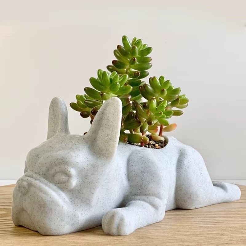 Denne indendørs blomsterpotte inkluderer en hvalpefigur integreret i designet. Den kan placeres på borde, skriveborde eller hylder. Den kompakte form gør det muligt at placere potten i forskellige indendørs områder samtidig med, at den tilføjer et dekorativt element.