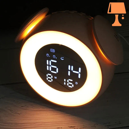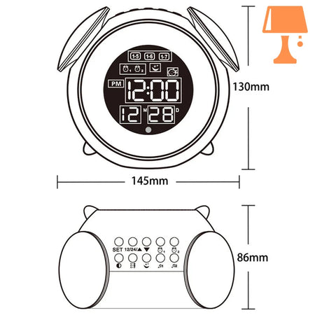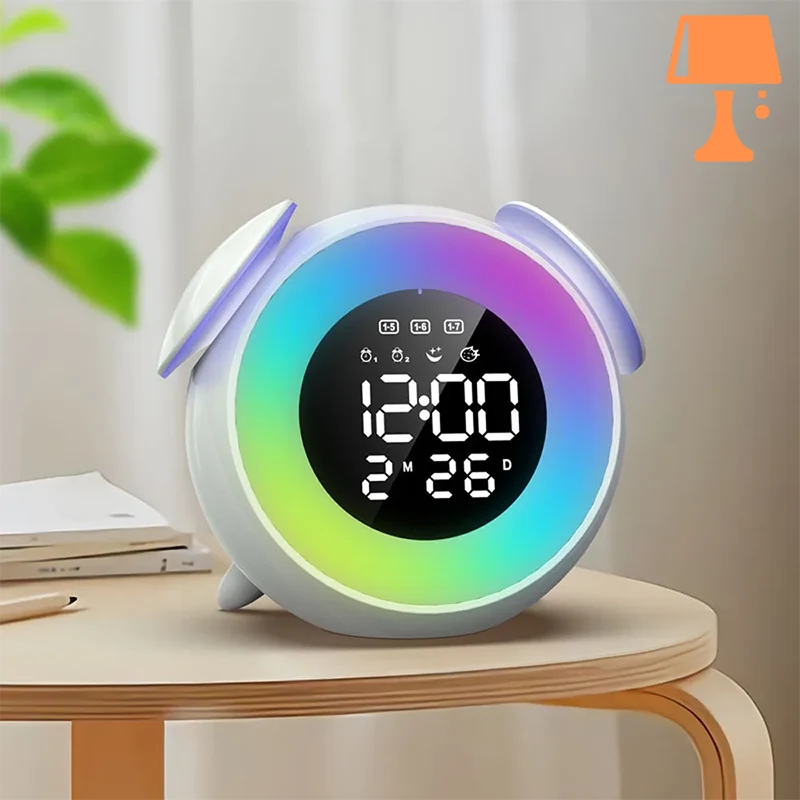 LumiTone kombinerer slank moderne æstetik med smart funktionalitet, hvilket gør den til en perfekt tilføjelse til ethvert rum. Med en cirkulær form, der minder om et klassisk vækkeur, har den to dekorative "klokker" på toppen for et unikt touch. Det digitale display viser klokkeslættet, alarmen, kalenderen og temperaturen med lyse hvide tal, mens en RGB LED-strimmel rundt om kanten tilbyder tilpasselig belysning til en dynamisk stemning.