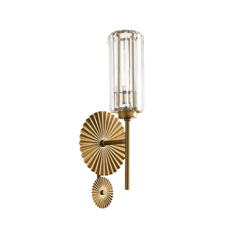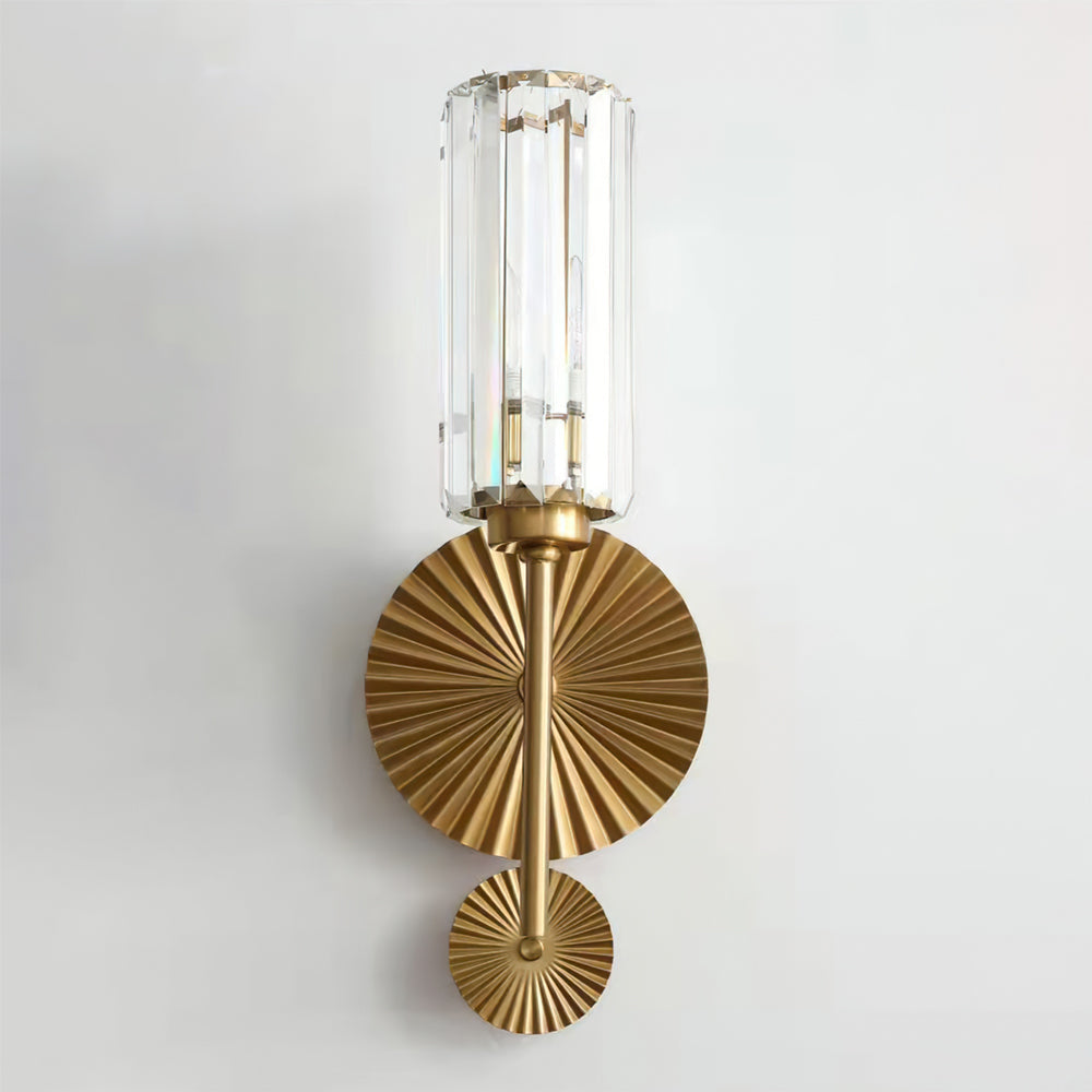 Denne væglampe har en gennemsigtig cylindrisk glasskærm med diagonalt snitdesign, kombineret med en metalbase. Den betjenes med en standard vægkontakt og er kompatibel med LED- eller Edison-pærer. Beregnet til indendørs brug.