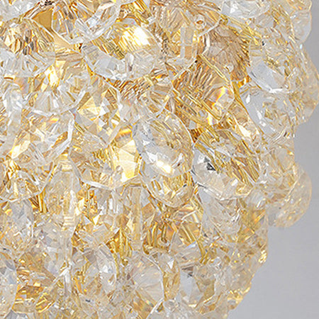 LustraGlow loftlamper har et kugleformet design pyntet med klare, krystallignende elementer, der skaber en glitrende effekt. Den metalliske jernbase med guldfinish tilføjer et elegant touch. En indbygget lyskilde er placeret i midten af kuglen, hvilket gør, at krystallelementerne fordeler lyset jævnt og fremhæver det teksturerede design, hvilket resulterer i et moderne og sofistikeret udseende.