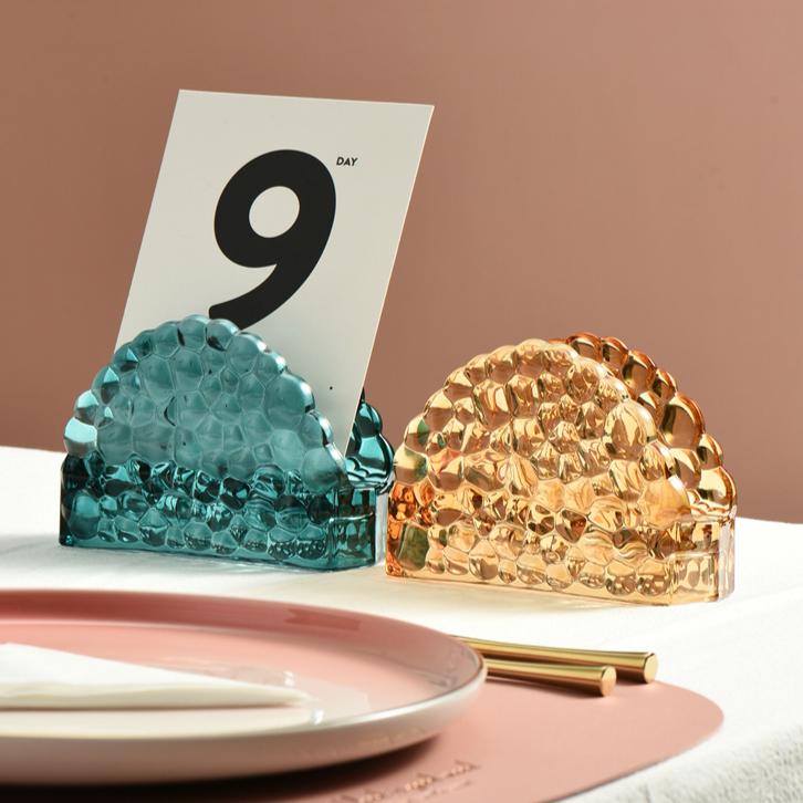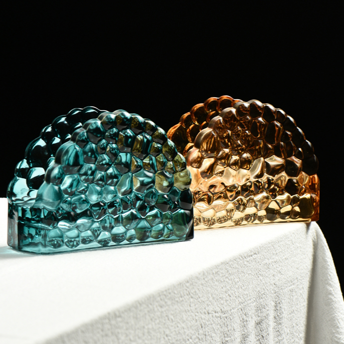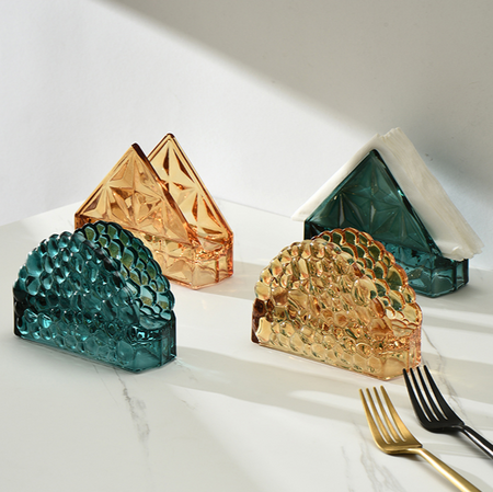 Fås i slående trekantede eller halvcirkelformede former, denne holder kommer i rig smaragdgrøn eller guld, der tilbyder et vintage-inspireret look. Dens luksuriøse æstetik løfter enhver madoplevelse, mens den fungerer som en stilfuld bordpladepynt. Designet til både skønhed og funktion, sikrer det, at servietter altid er tilgængelige for gæster.
