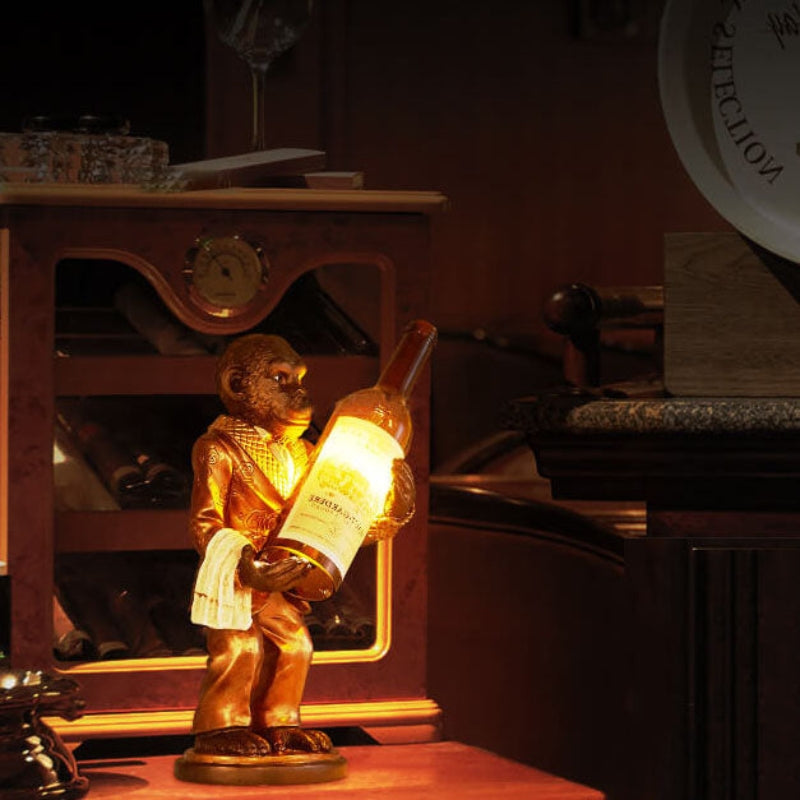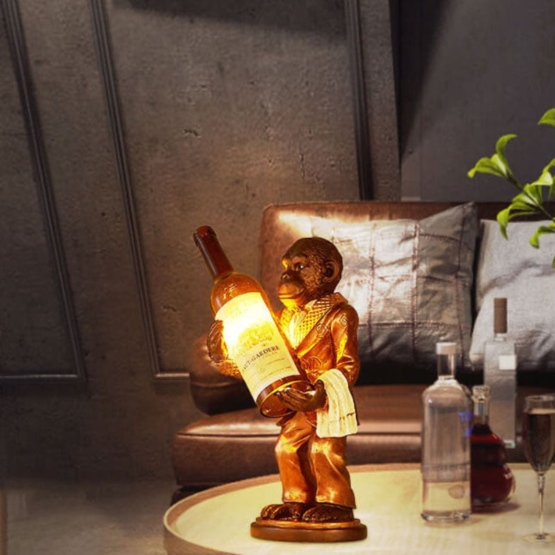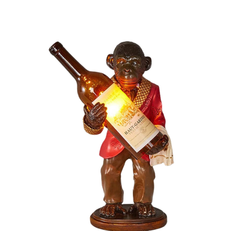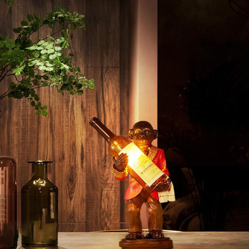 MonkeyGlow bordlampen har en legesyg abefigur iført farverigt tøj. Fremstillet af holdbar resin med en blank finish, giver den et varmt og indbydende skær. Fås i rød og guld, og er ideel til stuer, barer eller temarum.