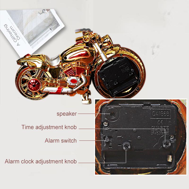 Dette vækkeur er designet til at ligne en motorcykel, og det har fint udformede detaljer, der giver det et realistisk og stilfuldt look. Den runde urskive er sømløst integreret i strukturen, hvilket gør den både funktionel og visuelt tiltalende. Dens dristige design gør den til en iøjnefaldende tilføjelse til ethvert rum, og tilføjer en unik charme til indretningen.