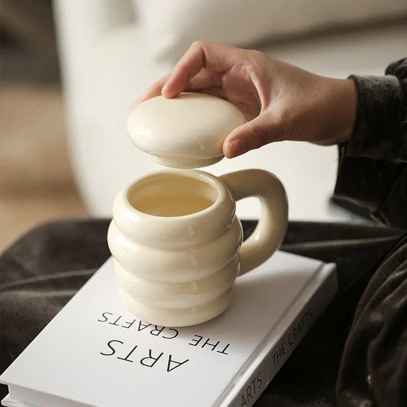 Kruset kommer med et matchende låg, hvilket øger dets alsidighed ved at holde drikkevarer varme og fordobles som en lille bakke. Uanset om det bruges til morgenkaffe eller som et dekorativt stykke, gør dens innovative form den til en fremtrædende tilføjelse til ethvert køkken eller kontor. Ideel til dem, der sætter pris på kreativt og funktionelt design.