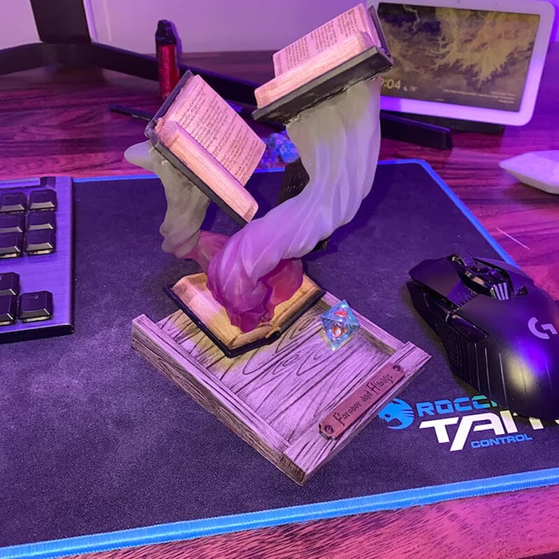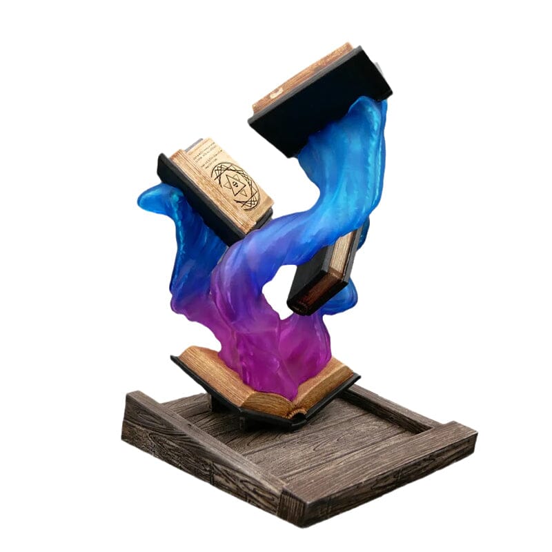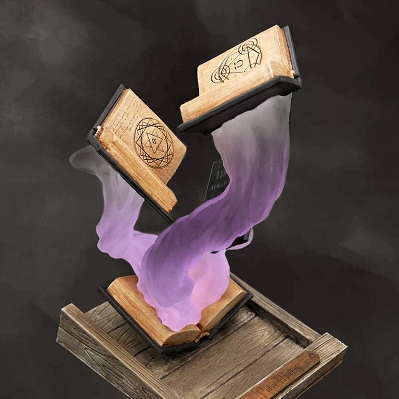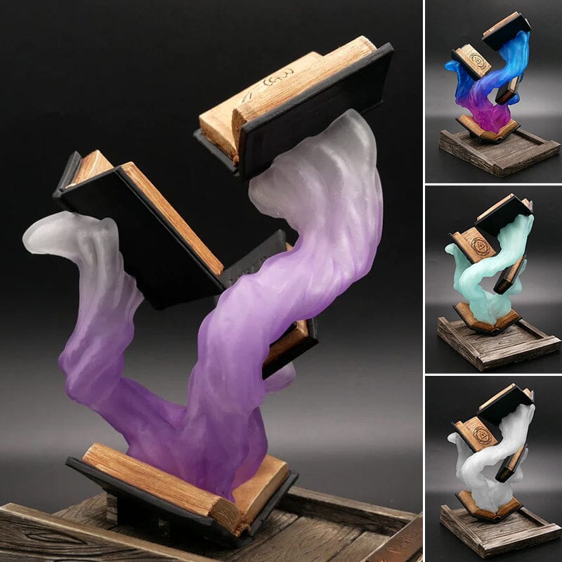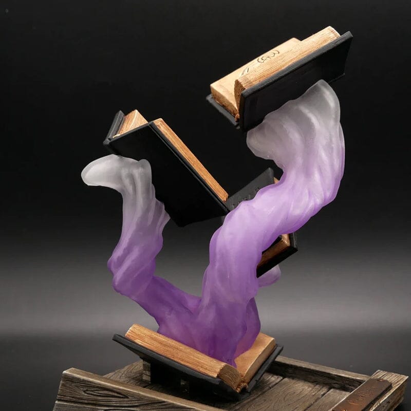 Omkring bøgerne er en farverig, hvirvlende damp, der forstærker følelsen af bevægelse og undren. De skiftende nuancer skaber et fascinerende display, hvilket gør det til et perfekt valg for dem, der elsker fantasy-inspireret indretning. Uanset om den placeres på et skrivebord, en hylde eller som en del af en temaopsætning, bringer den et kreativt og magisk præg til ethvert rum.