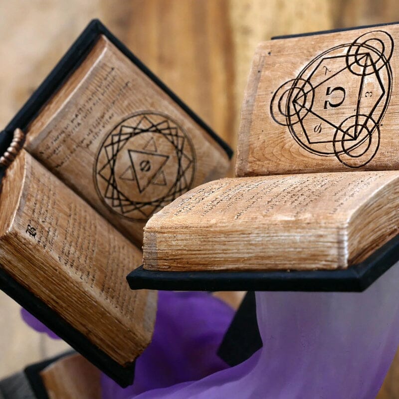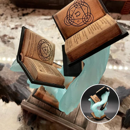 Dette dekorative stykke har to åbne bøger, der ser ud til at svæve over en base, hvilket skaber en fascinerende illusion. De detaljerede sider viser mystiske symboler og tekst i gammel stil, hvilket tilføjer en fortryllende følelse. Dens iøjnefaldende design gør den til en fantastisk tilføjelse til ethvert rum.