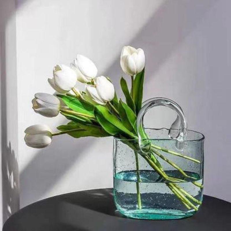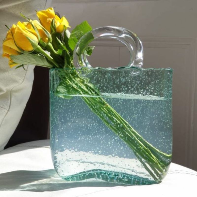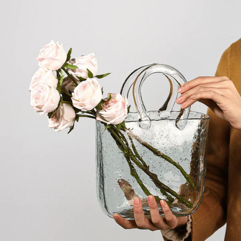 Denne blomstervase har et taske-inspireret design, som er velegnet til indendørs dekoration. Den kan rumme friske blomster eller dekorative arrangementer og kan placeres på hylder, borde eller skriveborde.