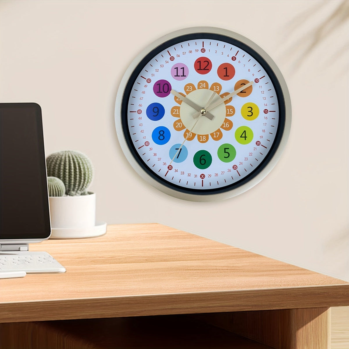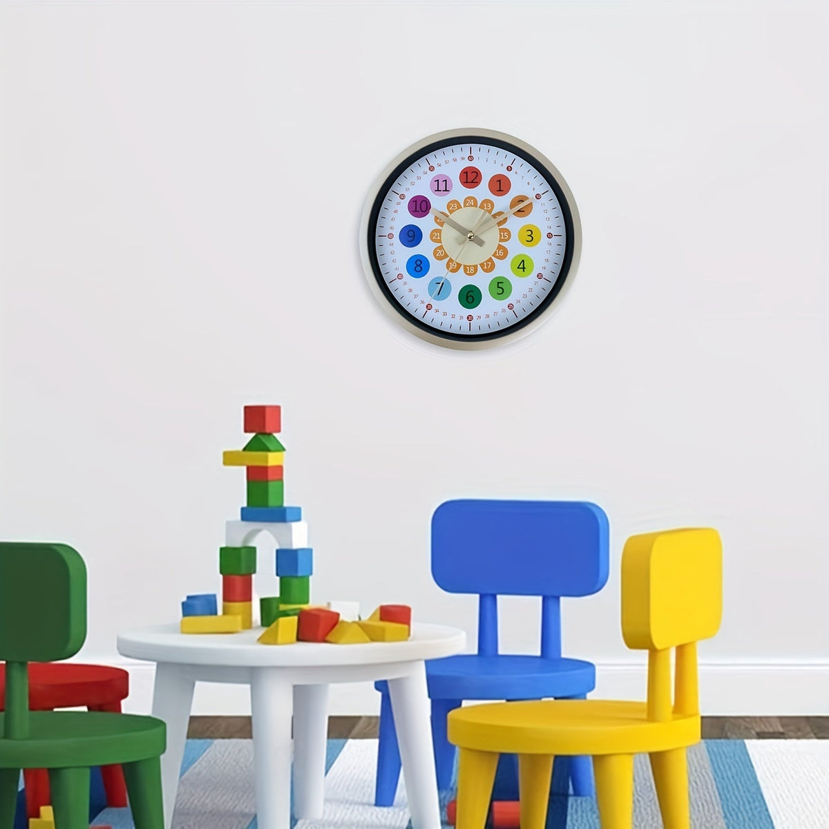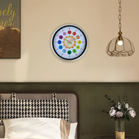 Med tydeligt markerede farverige tal opfordrer RainbowTime børn til at udvikle deres tidsfortællingsfærdigheder på en interaktiv måde. Det lydløse kvartsurværk sikrer et fredeligt miljø, fri for distraherende tikkende lyde. Dette ur kombinerer funktionalitet og sjov og understøtter læring, samtidig med at det tilføjer et lyst og indbydende præg til ethvert miljø.