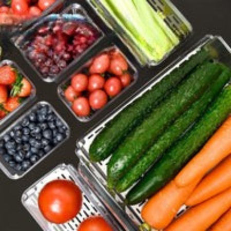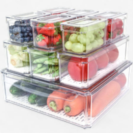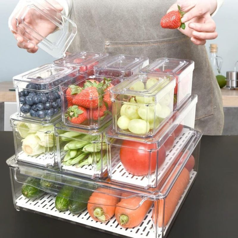 Organiser dit køkken og køleskab med disse klare opbevaringskasser med praktiske håndtag. De gør det nemt at opbevare og få adgang til frugt, grøntsager og snacks, samtidig med at de opretholder et pænt og ryddeligt rum.