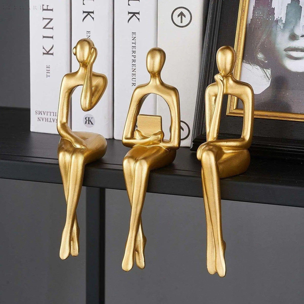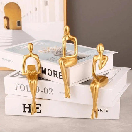Tilføj en sofistikeret kant til din indretning med disse slående gyldne tænkerstatuer. Designet i flere abstrakte poseringer - fra reflekterende stillinger til moderne gestus som at holde hovedtelefoner eller bøger - fortæller hvert stykke sin egen tankevækkende historie. Deres iøjnefaldende gyldne finish og udtryksfulde former gør dem til et dristigt og elegant statement i ethvert rum.