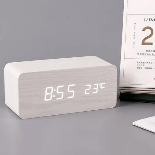 TimberTick kombinerer et slankt trædesign og moderne teknologi, hvilket gør den til den perfekte tilføjelse til ethvert soveværelse, stue eller arbejdsplads. Ikke kun løfter den din indretning, men den har også en indbygget trådløs opladningsplade, der fungerer med alle Qi-aktiverede enheder, der kombinerer stil og praktisk for din bekvemmelighed.